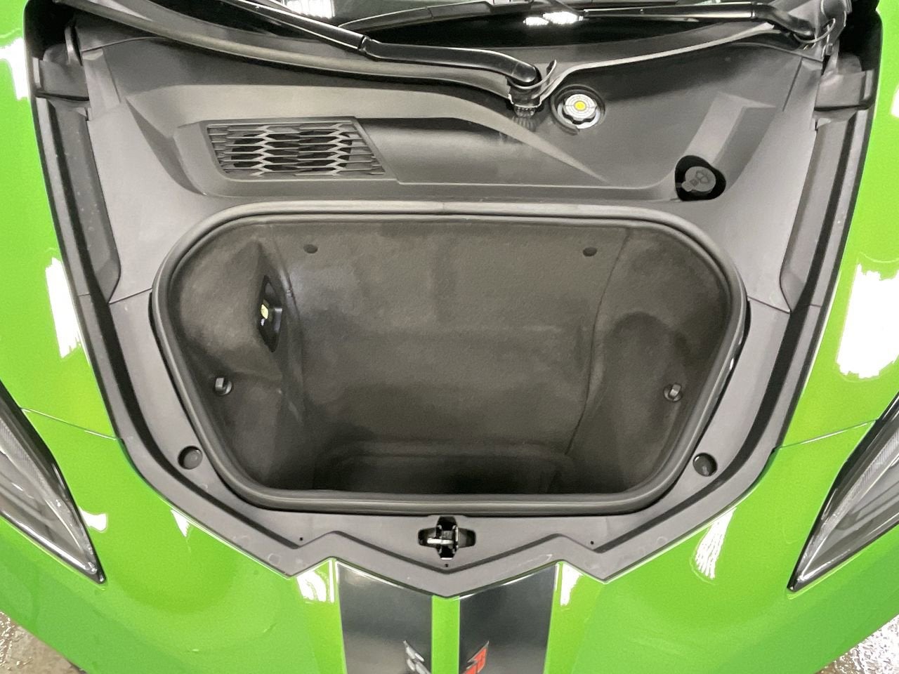 This Stingray sits on black-painted forged aluminum wheels and includes multiple Carbon Flash exterior accents, ground effects, black exhaust tips, and a rear wing spoiler for a bold, aggressive look.
