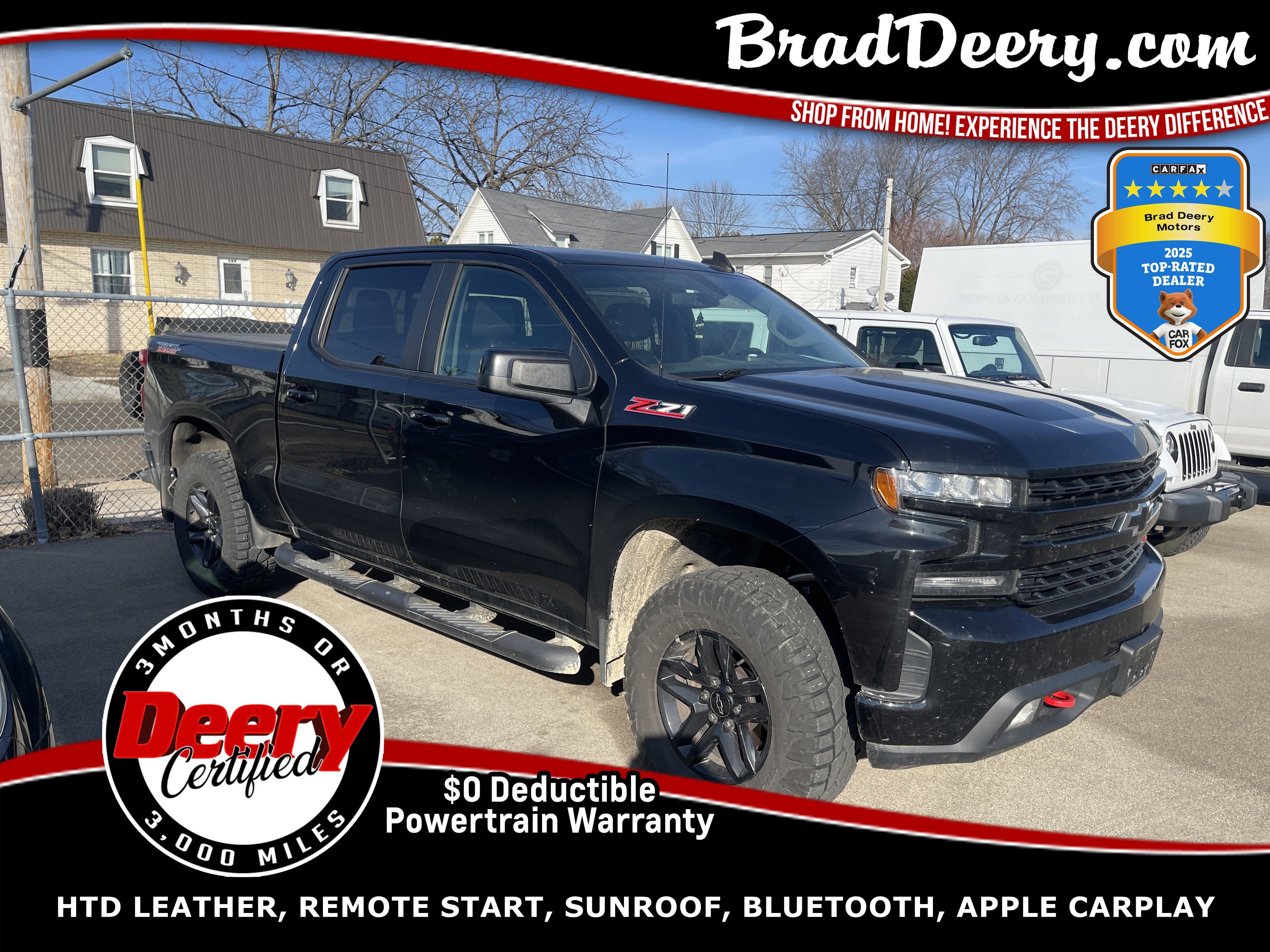 ** EXCELLENT LOCAL TRADE **, ** 4X4 **, ** LT **, ** TRAIL BOSS **, ** POWER SUNROOF **, ** HEATED LEATHER SEATS **, ** HEATED STEERING WHEEL **, ** REMOTE START **, ** NO ACCIDENTS **, ** NON-SMOKER **,** DEERY CERTIFIED - COMPLEMENTARY 3MO/3,000-MI WARRANTY ON SELECT MECHANICAL COMPONENTS **, ** INFOTAINMENT SYSTEM W/ 8" COLOR TOUCHSCREEN **, ** Bluetooth® HANDS-FREE CELLPHONE CONNECTIVITY **, ** SIRIUS XM **, ** ONSTAR CAPABLE 4G LTE WI-FI HOTSPOT **, ** APPLE CARPLAY & ANDROID AUTO CAPABILITY **, ** MEDIA HUB (AUX./USB) **, ** BOSE PREMIUM AUDIO/SOUND **, ** REARVIEW - BACK-UP CAMERA/MONITOR **, ** POWER DRIVER SEAT w/ POWER LUMBAR ADJUSTER **, ** REMOTE KEYLESS ENTRY **, ** KEYLESS GO/PUSH BUTTON START **, ** POWER HEATED MIRRORS **, ** POWER WINDOWS & LOCKS **, ** POWER SLIDING REAR WINDOW **, ** TILT & TELESCOPIC STEERING COLUMN **, ** STEERING WHEEL AUDIO/RADIO CONTROLS **, ** CRUISE/SPEED CONTROL **, ** A/C AUTO TEMPERATURE CONTROL W/ DUAL ZONE CONTROL **, ** FRONT BUCKET SEATS **, ** SPLIT FOLD-UP REAR SEAT **, ** FACTORY TRAILER TOW PACKAGE **, ** INTEGRATED TRAILER BRAKE CONTROL **, ** TRAILER SWAY CONTROLLER **, ** HEAVY-DUTY LOCKING REAR DIFFERENTIAL **, ** EZ LIFT TAILGATE **, ** LED CARGO AREA LIGHTING **, ** SPRAY-IN BEDLINER **, ** ASSIST STEPS **, ** REAR CORNER STEP BUMPER **, ** TONNEAU COVER **, ** LED FOG LAMPS **, ** 110-VOLT AUXILIARY POWER OUTLET **, ** 18" BLACK PAINTED ALUMINUM WHEELS **, ** BLACK BOW TIE EMBLEMS PKG. **, ** UNIVERSAL HOME REMOTE **, ** Z71 OFF-ROAD SUSPENSION PKG. **, ** 5.3L ECOTEC3 V8 **, ** AIR CONDITIONING **.